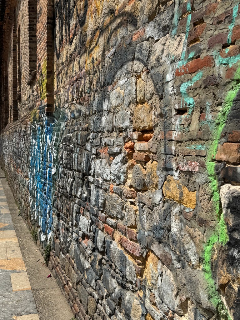 Iglesia de San Francisco, una de las edificaciones más antiguas de Bogotá. El muro evidencia procesos simultáneos de deterioro material y de intervención antrópica que desdibujan sus valores históricos. La superposición de grafías, pérdida de material y exposición ambiental no solo afecta la integridad física del bien, sino que refleja una relación cada vez más frágil entre la ciudad contemporánea y su patrimonio construido.