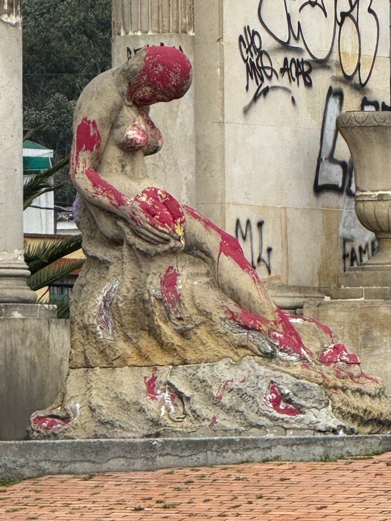 Intervención vandálica sobre escultura patrimonial en espacio público. La acción, lejos de ser un gesto aislado, evidencia tensiones entre expresión social, abandono institucional y fragilidad en los mecanismos de protección del patrimonio cultural.